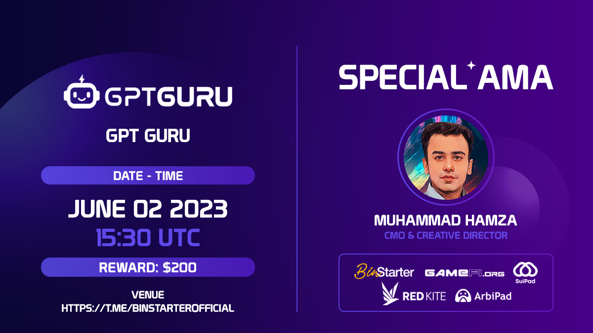 BinStarter is very honored to have an opportunity to launch the IDO event for the GPT Guru project. GPT Guru is a next-generation AI tool empowering the Web 3.0 community fueling their creativity and productivity to unlock their true potential. Powered by AI and Machine Learning, GPT Guru $GPTG