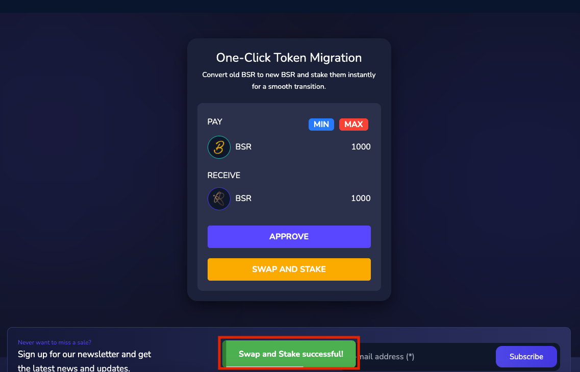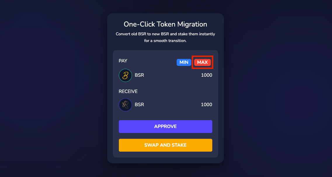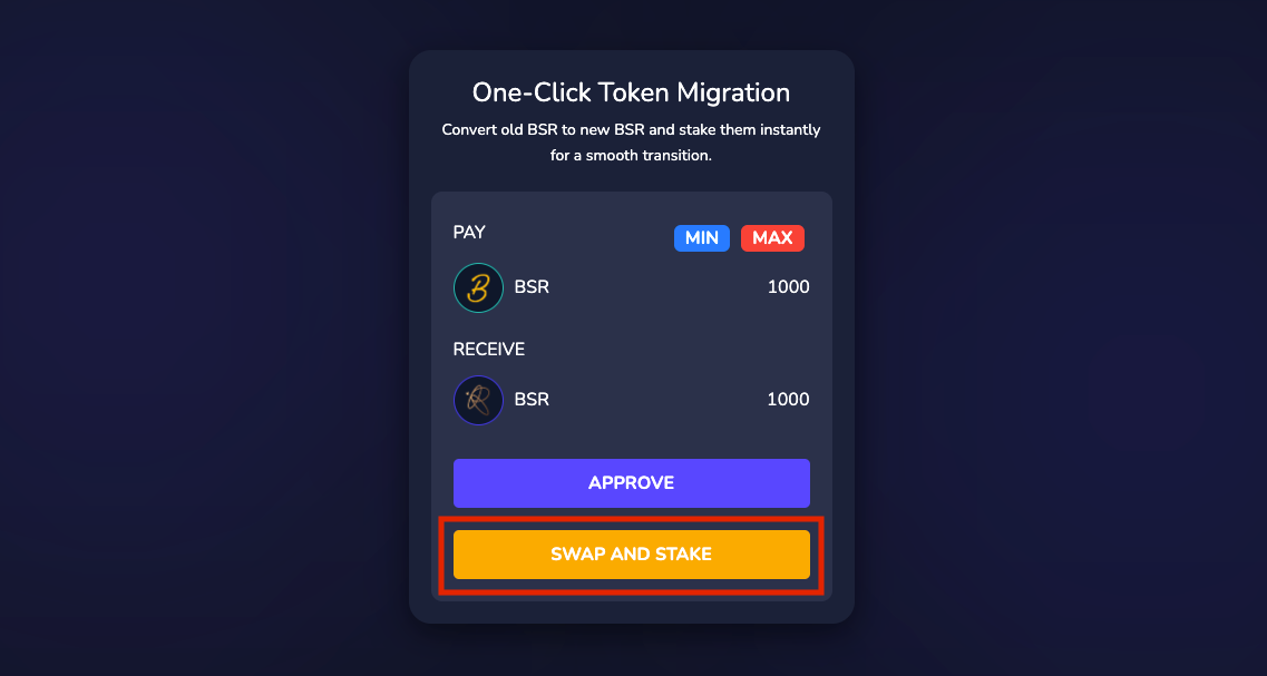 6. Swap and Stake: After approval, click the "Swap and Stake" button to exchange your old BSR for the new BSR and automatically stake them.