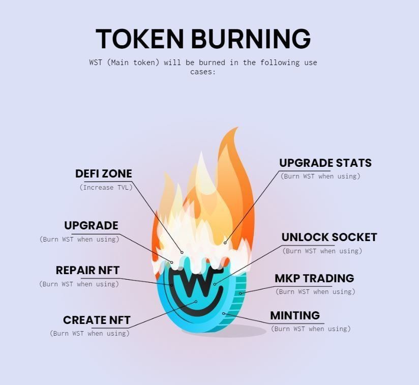 $WST is used for: Fees for processing transactions; Mint, Repair, upgrade NFTs, Unlock Gem Socket, Buy energy; Staking, Farming in DeFi Zone; Buy NFTs in the Marketplace; Convert $WSS into $WST to perform liquidity; Governance vote to determine the development game features, roadmap…