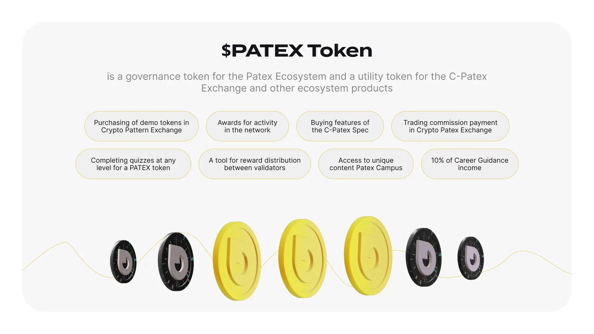 These diverse utilities demonstrate the multifaceted role of the Patex token, ranging from facilitating practical learning and incentivizing engagement to serving as a means of payment, thus enhancing its overall value within the Patex ecosystem. In addition, additional functionalities will be incorporated into all forthcoming Patex decentralized applications.