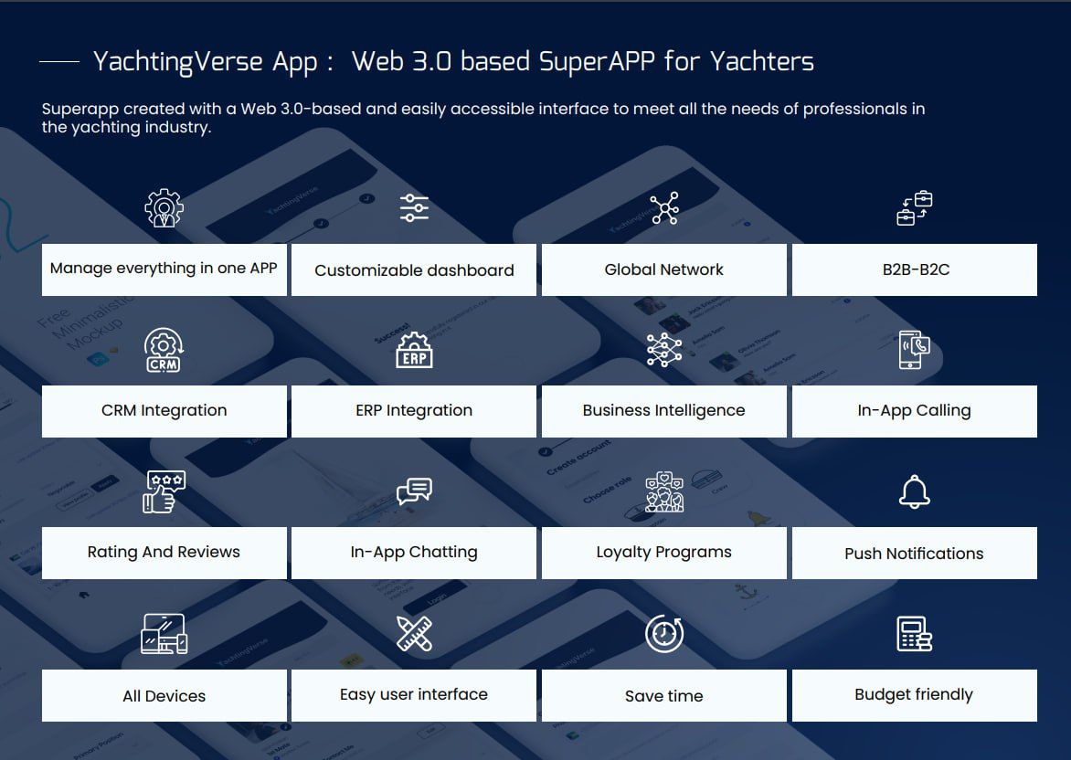 Yachting Verse - the world's first marine themed metaverse/ VR platform and SuperAPP designed specifically for the yachting industry. It is not only business to business but also business to individual and individual to individual. Our IDO deal with this EIP-protected project will take place on April 30th, 2023