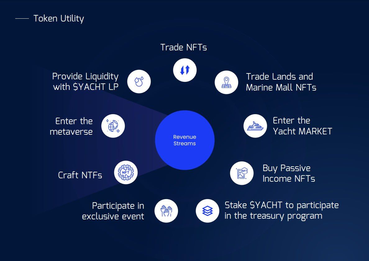 The token used in the YachtingVerse project is the YACHT token. The YACHT token is required for users to transact and pay on the YachtingVerse platform. We will also offer privileges to YACHT token holders such as Discounts, Priority Access, DAO Voting Rights, Staking, Collaborations. The YachtingVerse team is working to expand the usage areas of the YACHT token. As part of these efforts, new features and products are being added to give YACHT token holders more benefits and increase the token value.